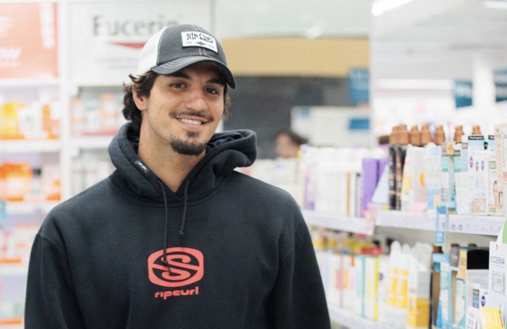 Sorridente e de visual despojado, Medina atraiu a atenção de quem passava pelo local. Ele parou na Droga Raia, onde comprou produtos de uso pessoal e atendeu com simpatia os fãs que pediram fotos e autógrafos.