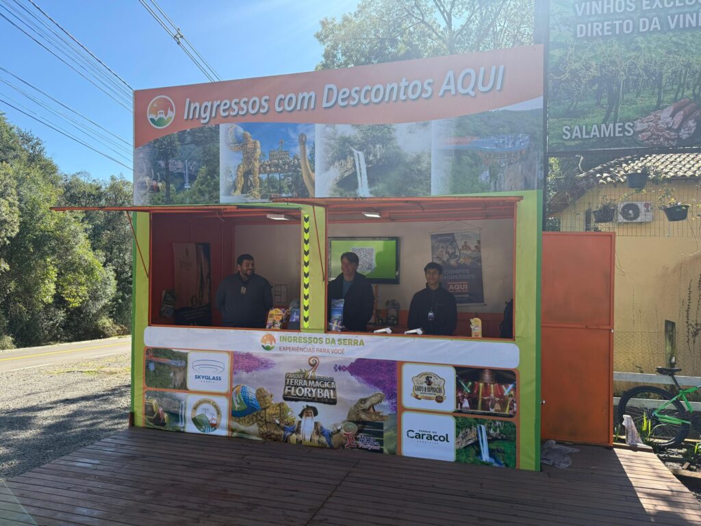 Para quem prefere atendimento ao vivo, o Ingressos da Serra também conta com um quiosque físico estrategicamente localizado na estrada entre Gramado e Canela, bem próximo ao famoso Parque Terra Mágica Florybal (Parque dos Dinossauros). No local, os visitantes recebem dicas turísticas, ajuda na organização do roteiro e podem garantir ingressos de última hora com total comodidade.