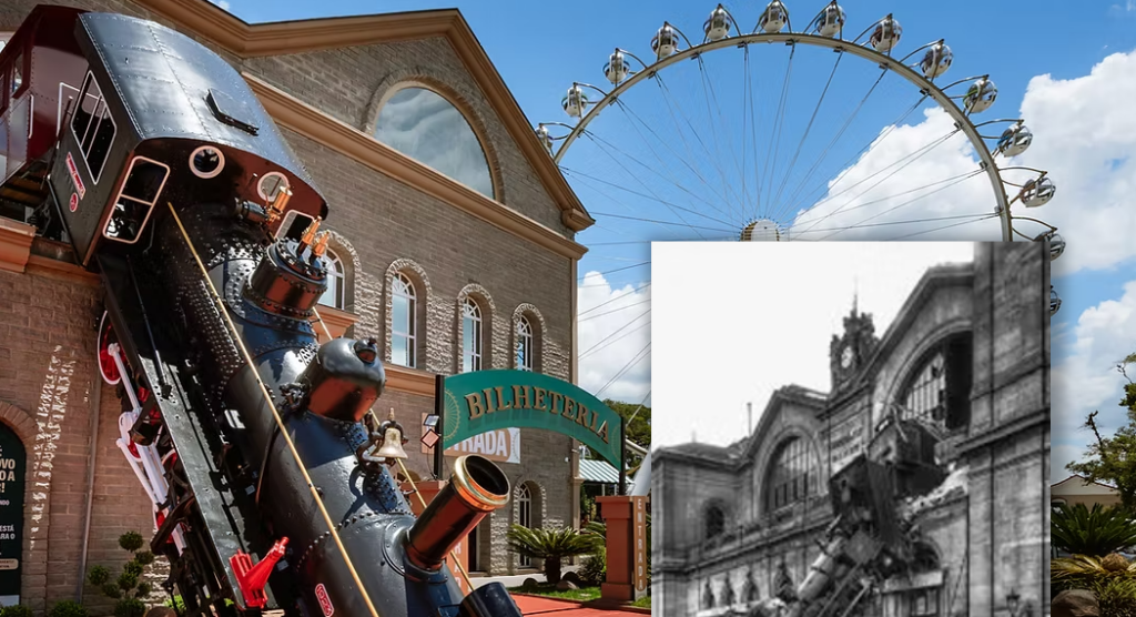 Além da Roda Canela, outro grande destaque é o Parque Mundo a Vapor, que já se tornou um verdadeiro cartão-postal da região. Sua fachada icônica, com um trem “saindo” do prédio, chama a atenção de quem passa pela rodovia e rende fotos memoráveis. O que muitos visitantes não sabem é que essa fachada é inspirada em um acidente histórico real, ocorrido em 1895, em Paris, na estação Gare Montparnasse. Na ocasião, um trem a vapor não conseguiu frear a tempo, atravessou a parede do segundo andar da estação e ficou pendurado para fora da construção — uma cena que entrou para a história.