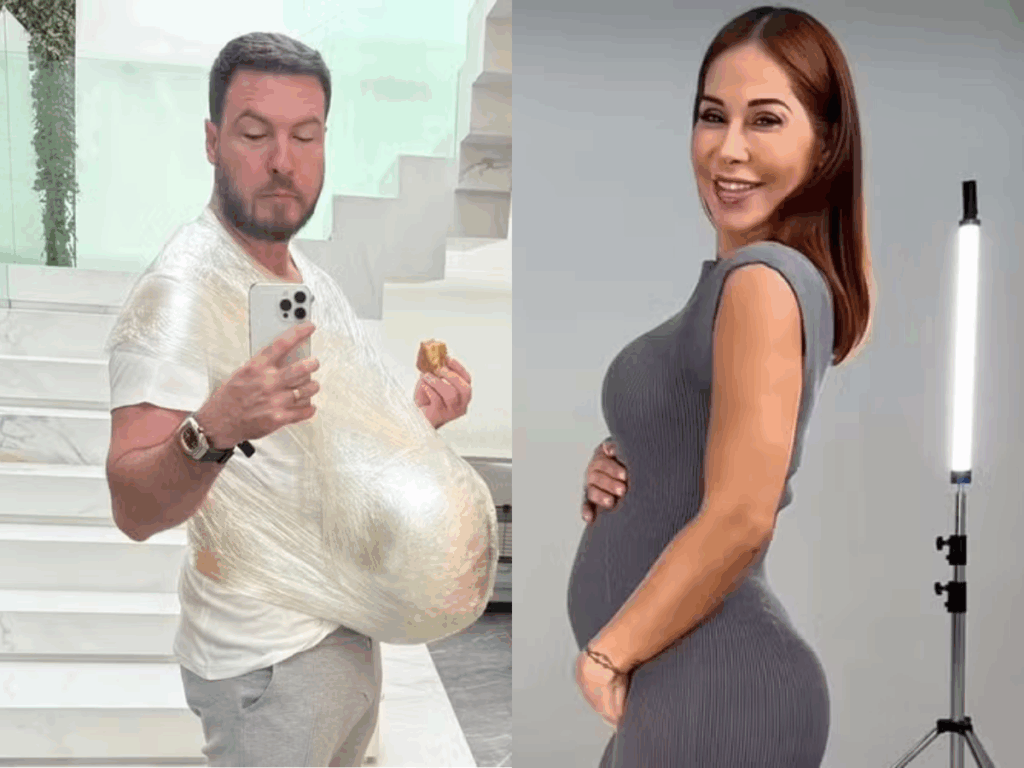 Para reproduzir o peso e o tamanho da barriga, o empresário improvisou com uma melancia presa ao corpo com fita adesiva, simulando o volume do abdômen na reta final da gravidez.