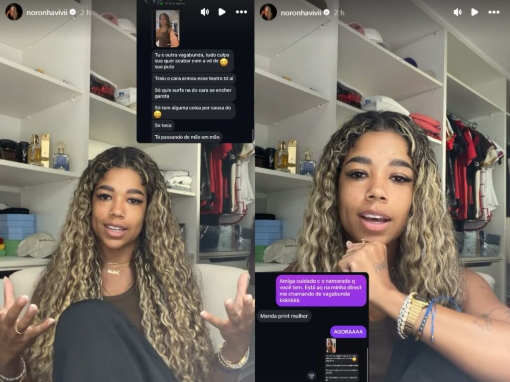 “Fui no perfil dele, achei o da namorada e mandei: ‘Cuidado com seu namorado, ele tá vindo aqui na minha direct me xingar’”, contou Vivi, explicando que a ação foi rápida e prática, sem precisar se desgastar em bate-boca público.