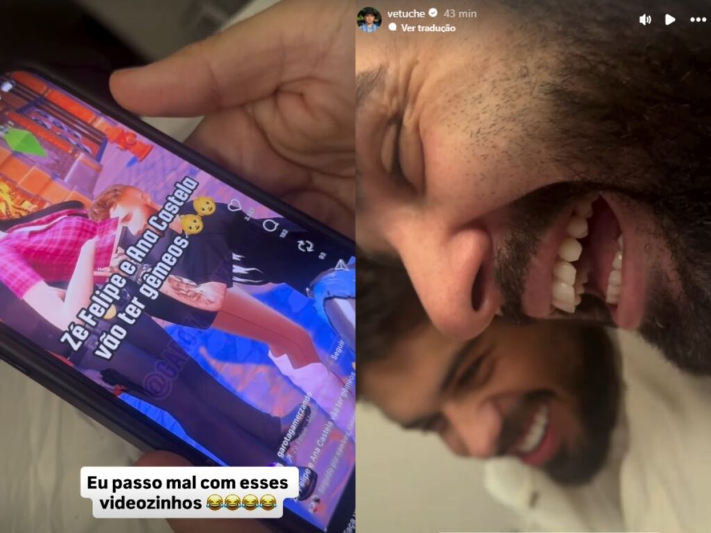 A presença de Zé Felipe na residência de Ana Castela em Londrina, Paraná, nesta segunda-feira (22/9), continuou rendendo momentos de diversão no dia seguinte. Um vídeo compartilhado nos stories de Gabriel Vetuche, amigo da cantora, mostrou o cantor acompanhado de Odorico Reis e outro amigo caindo na risada ao assistir a uma paródia criada no jogo de simulação de vida “The Sims”.